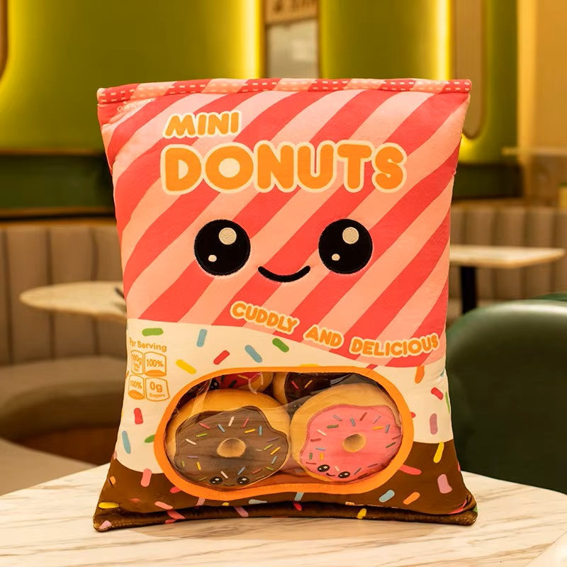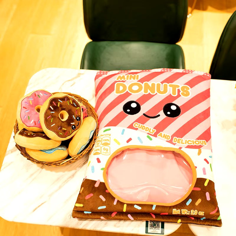 These frosted donut plushies are just over 6 inches wide and come in a vibrantly decorated bag that is as cuddly as it is cute. The bag mirrors the donuts, with a smiling face and delicious looking sprinkles. The full bag measures at 19.6”inches tall and 15.7 inches wide, so get ready to curl up and fall fast asleep after you finish your donut feast. With all that this plushy has to offer, it is the perfect gift for adults and kids alike!
