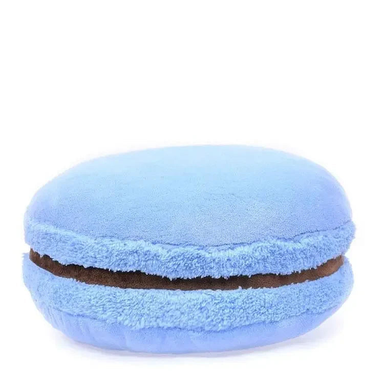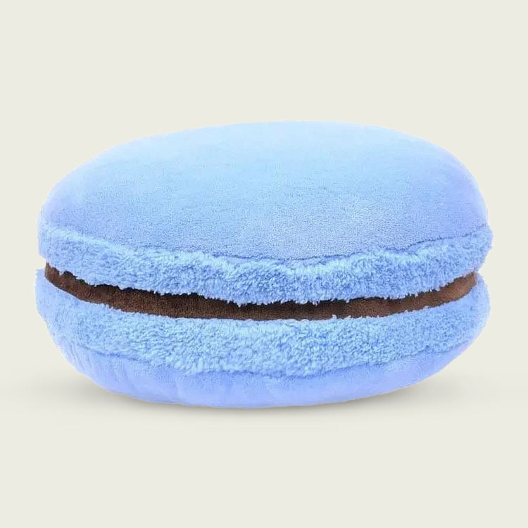 The blue beast featured here measures 14.6 inches in diameter, and has a silky exterior made of soft plush polyester. Just like a real macaron, there's a stark difference in texture between the outer part and the gooey center, and this toy plays into this by incorporating polypropylene cotton down for a squish that's so silky that it's almost slippery. Should your stuffy become dirty, a mild soap and warm water should be all it needs. Putting it through the extremes in temperature and handling that come with a machine cycle could result in shrinkage, fading, or warping.