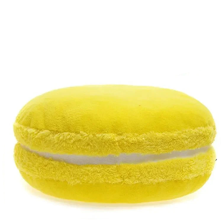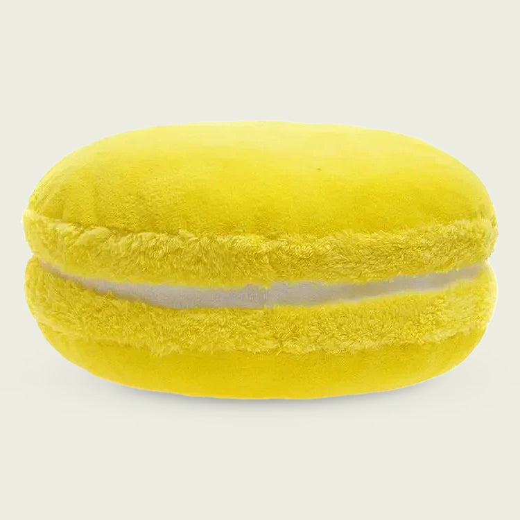 Macarons are usually fairly small, but this one comes in at 14.6 inches in diameter. It's made of soft plush polyester, with an inner stuffing made of polypropylene cotton down for an extra silky squish. If your little lemon gets dirty, wash it by hand with warm water and mild soap; doing otherwise can cause fading and shrinkage.
