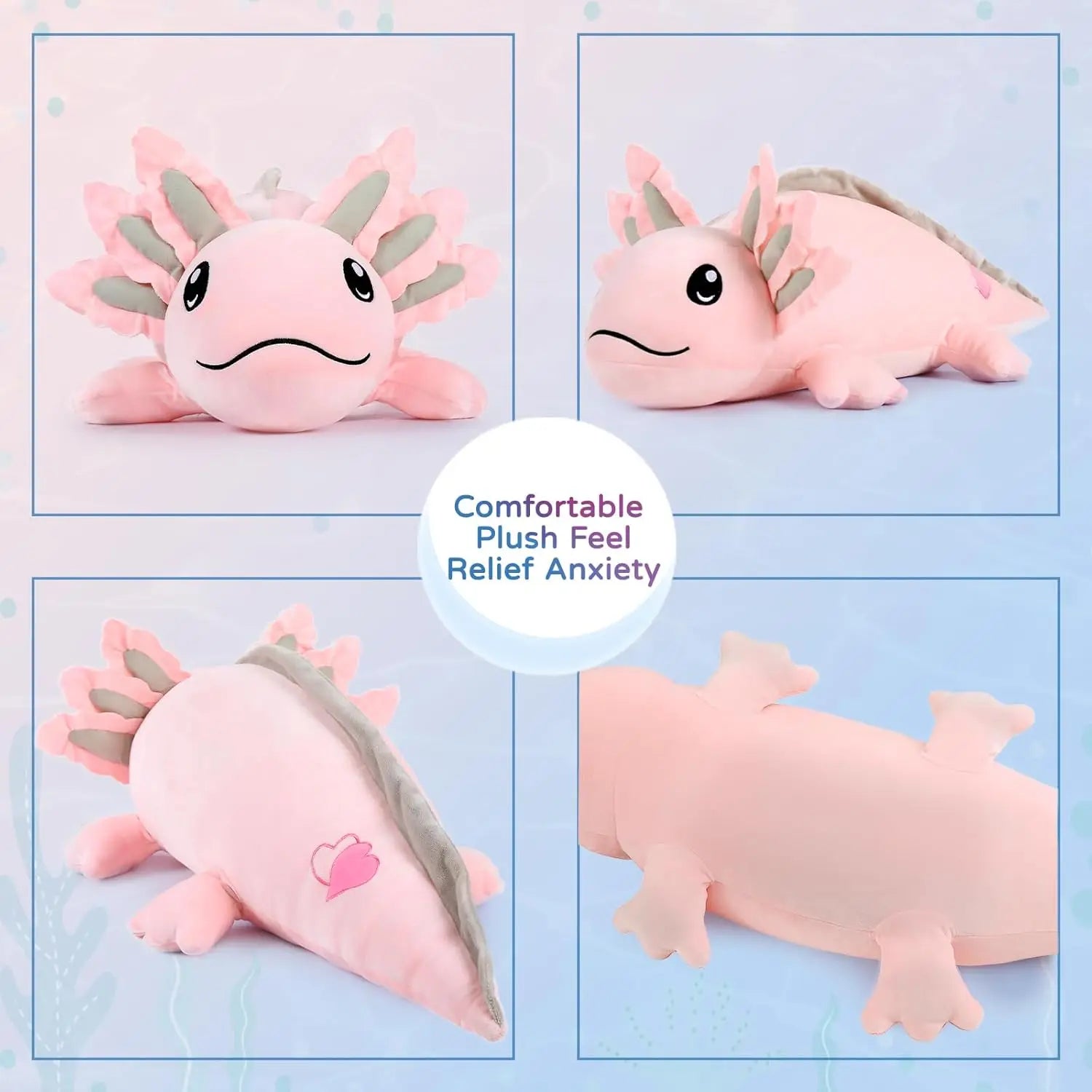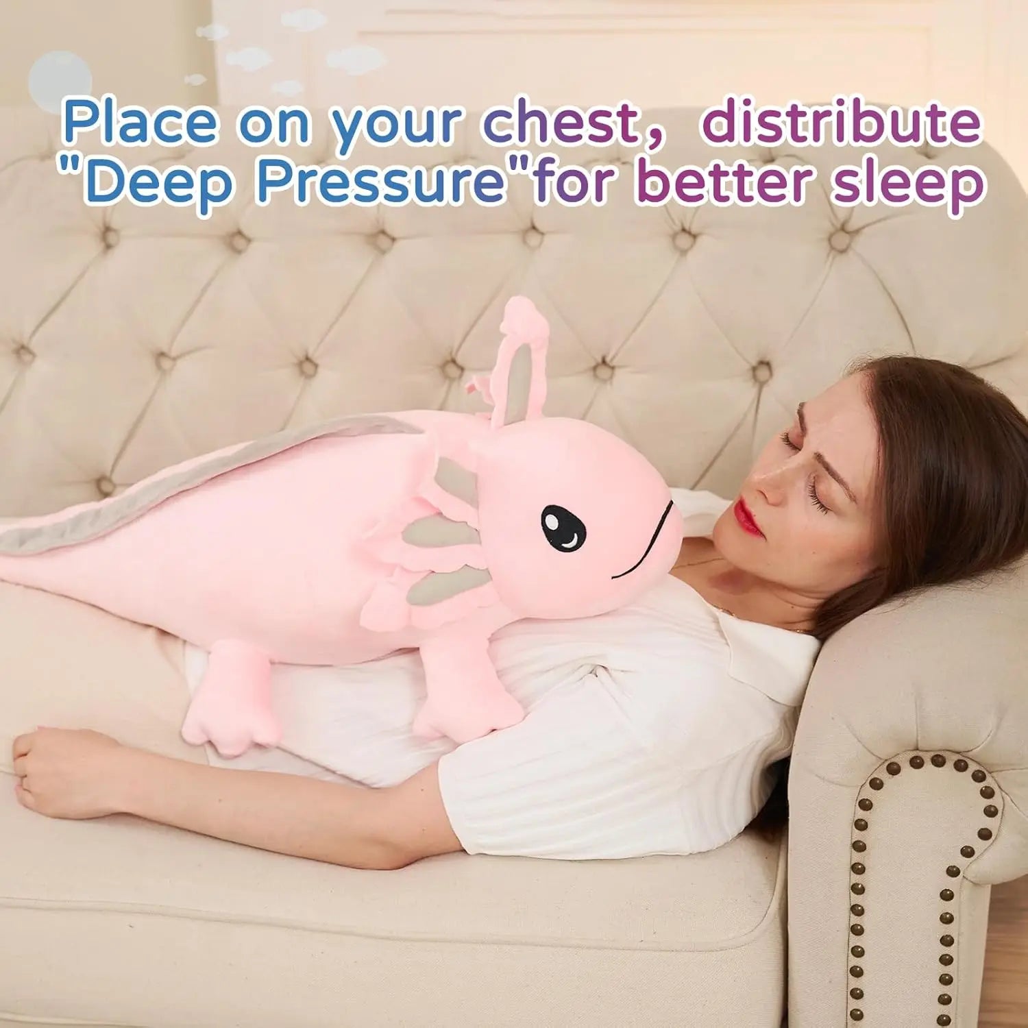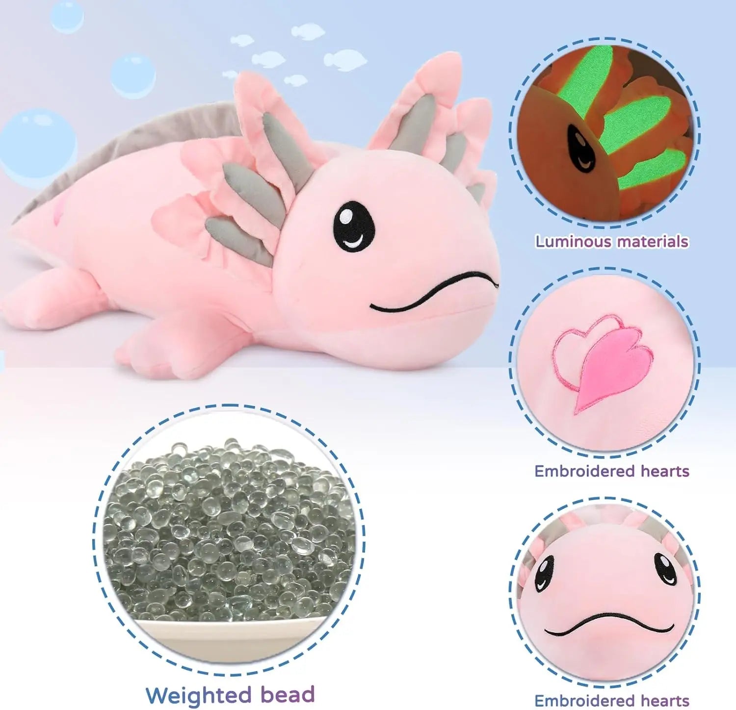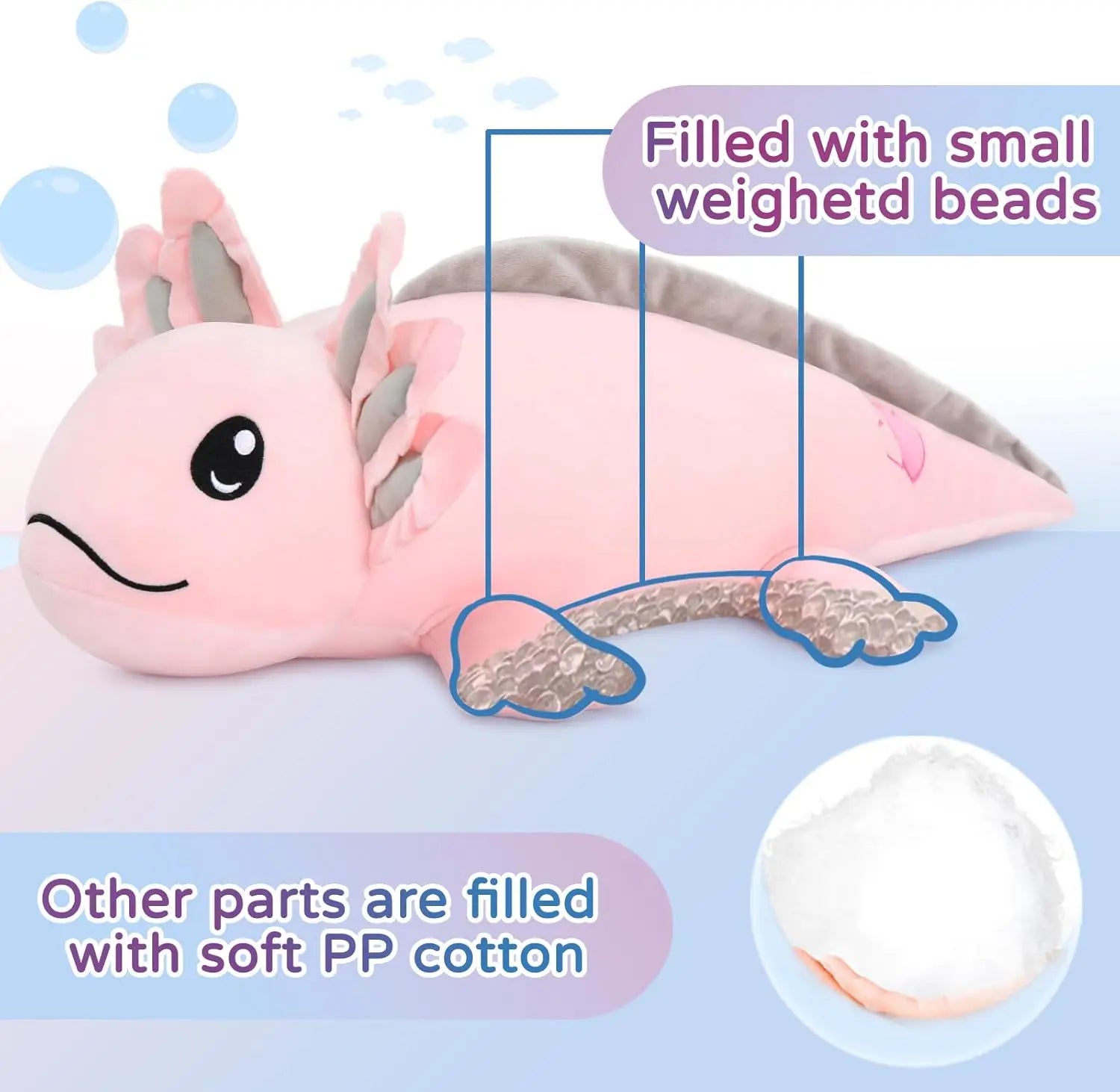 This hefty friend is your key to better sleep, anxiety relief, and more! Our new Weighted Axolotl plushie is here, and it's ready to serve as your rock and anchor. Kids, in particular, will be sure to feel its magic with one cuddle. You can put this special plushie on your chest for better sleep, let it sit in your lap to reassure you, or simply pick it up and give it a hug. This toy also sports glow-in-the-dark fins, a soft exterior, and a pillowy, silky feel under its surface, thanks to the specially treated filling.