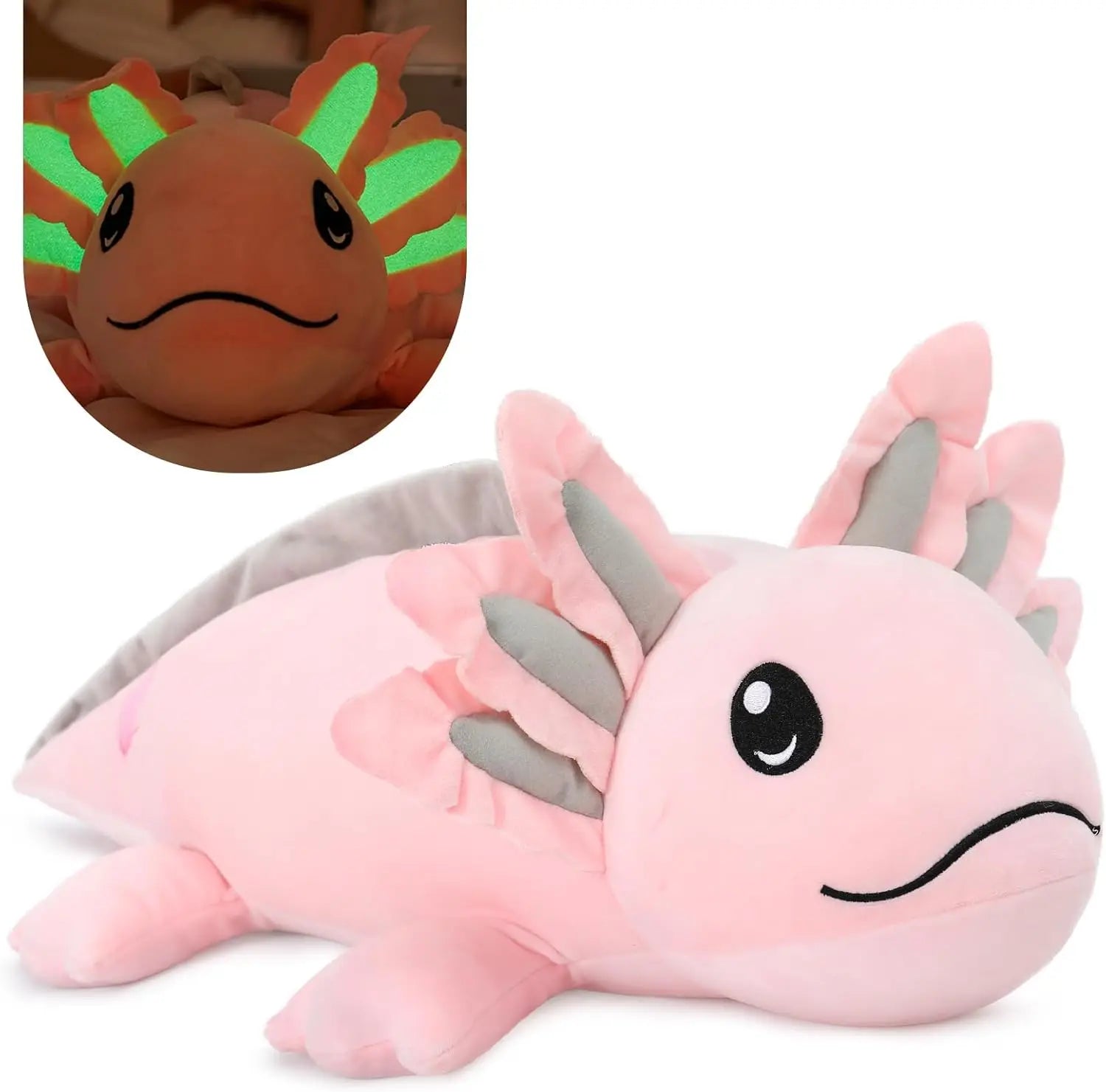 The Weighted Axolotl comes in a pleasant pink color, with gray gills that light up green in darkness, after being charged in sunlight. Select areas of the toy are filled with weighted beads, bringing the total weight of the plushie to about 4 pounds. The rest of its 31.5 inch length is stuffed with a special polypropylene cotton down that's silky to the touch, and the outside is plush polyester. If the toy gets dirty, it's best to wash it inside a pillowcase, and to use warm water. Washing in water that's too hot or too cold could cause fading, shrinkage, issues with the weighted beads, and other trouble.